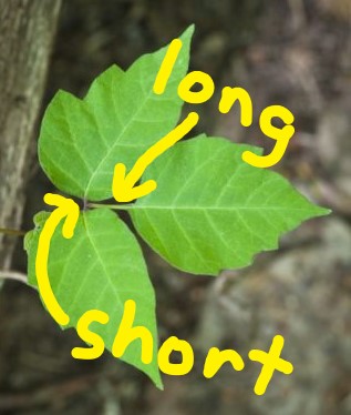 The three leaflets each have a little stem (called a petiolule) connecting the leaflet to the main stem of the plant. On poison ivy, the petiolule of the central leaf is quite long, while the petiolules of the side leaflets are short, with the leaflet almost being connected to the main stem itself.